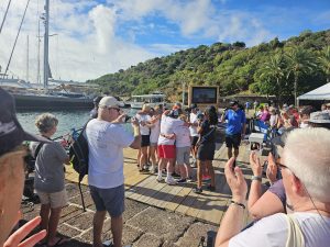 Their family and friends lined the fortifications on the headland above the historic Nelson’s Dockyard, all wearing T-shirts bearing the boys’ Greens 2 Blue team logo (organised by David’s wife Jackie), honking horns, cheering, clapping, unfurling banners and even a Sheffield Wednesday flag brought by Richard’s son Oliver.