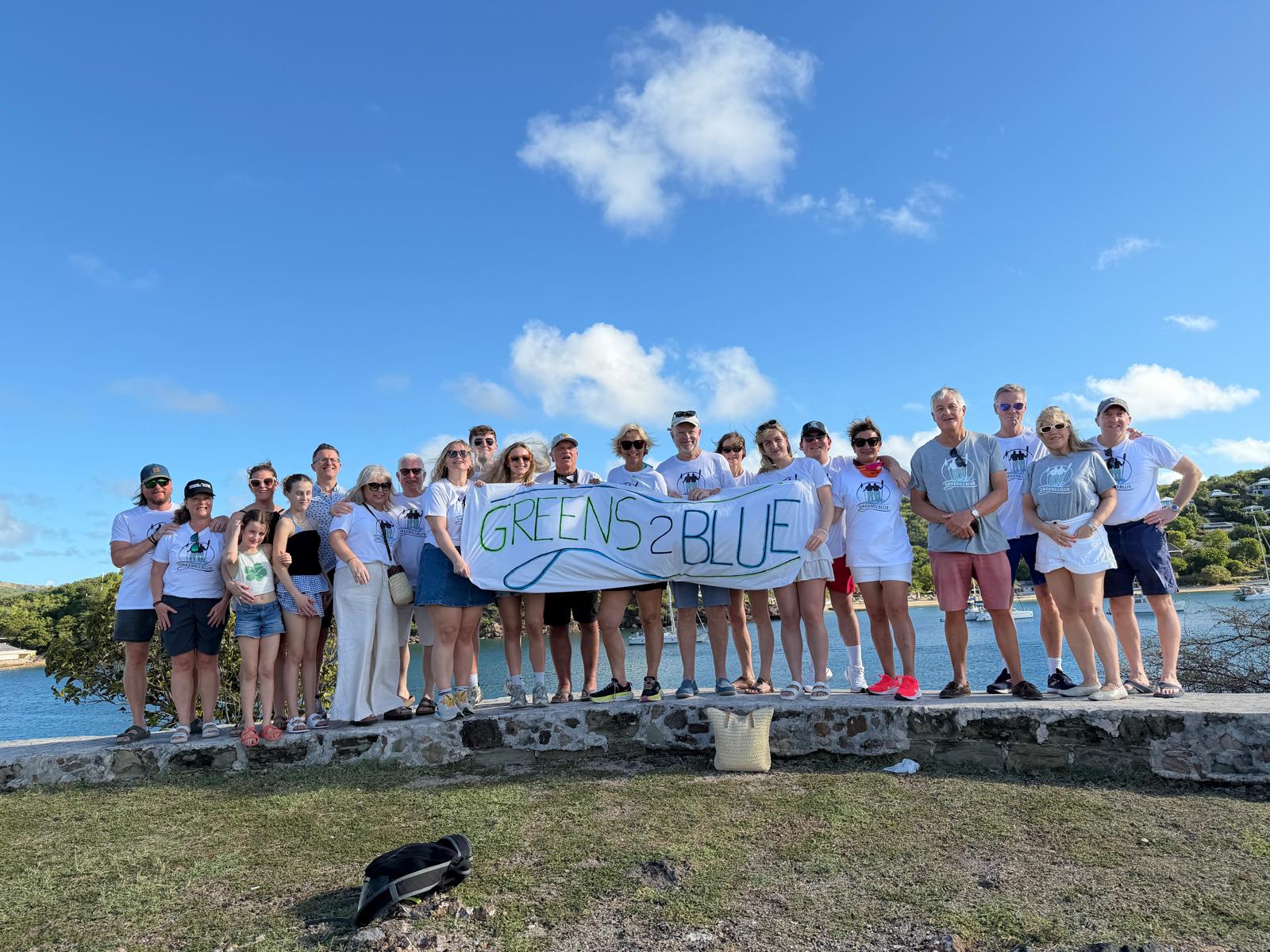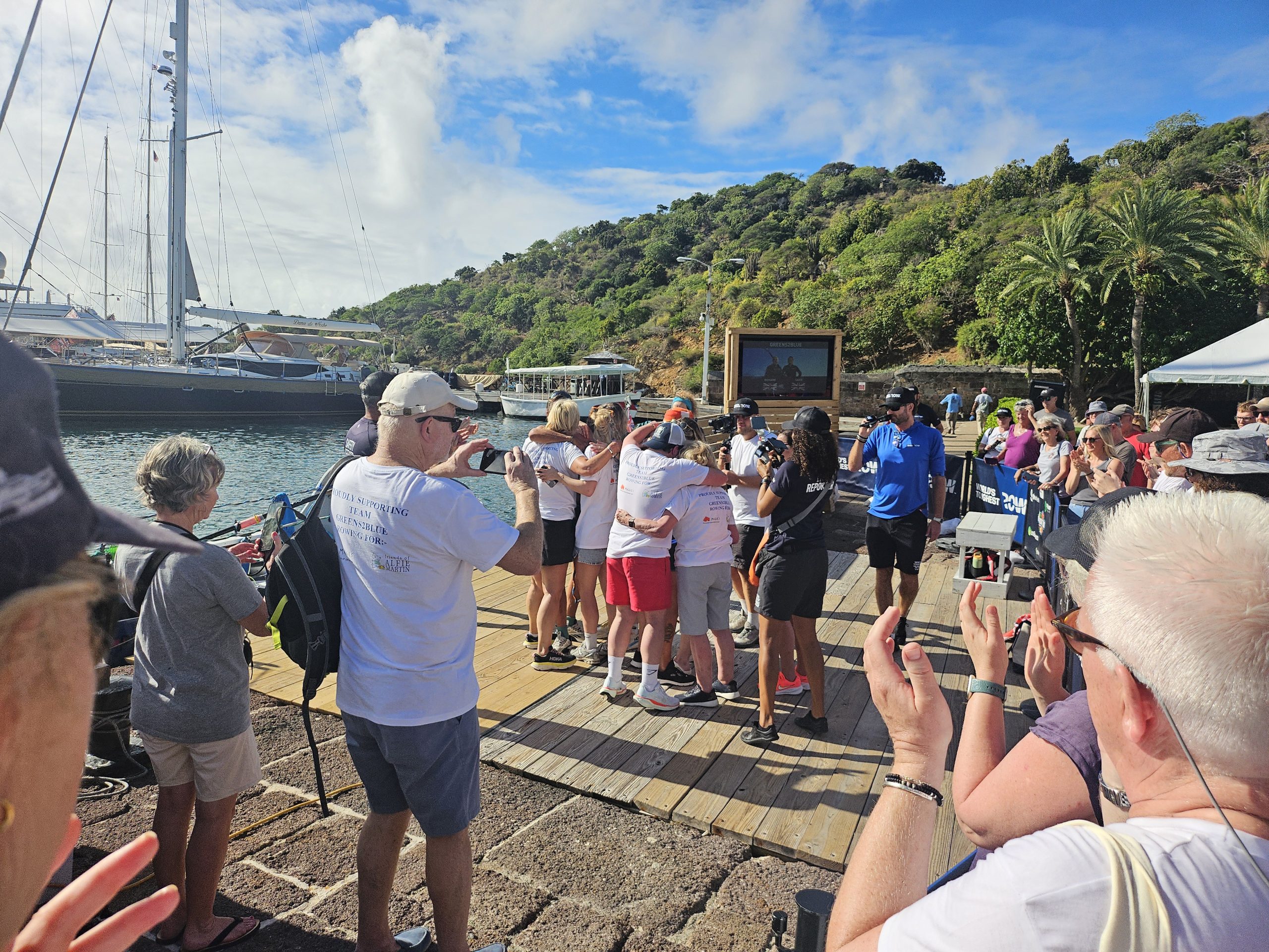 Their family and friends lined the fortifications on the headland above the historic Nelson’s Dockyard, all wearing T-shirts bearing the boys’ Greens 2 Blue team logo (organised by David’s wife Jackie), honking horns, cheering, clapping, unfurling banners and even a Sheffield Wednesday flag brought by Richard’s son Oliver.